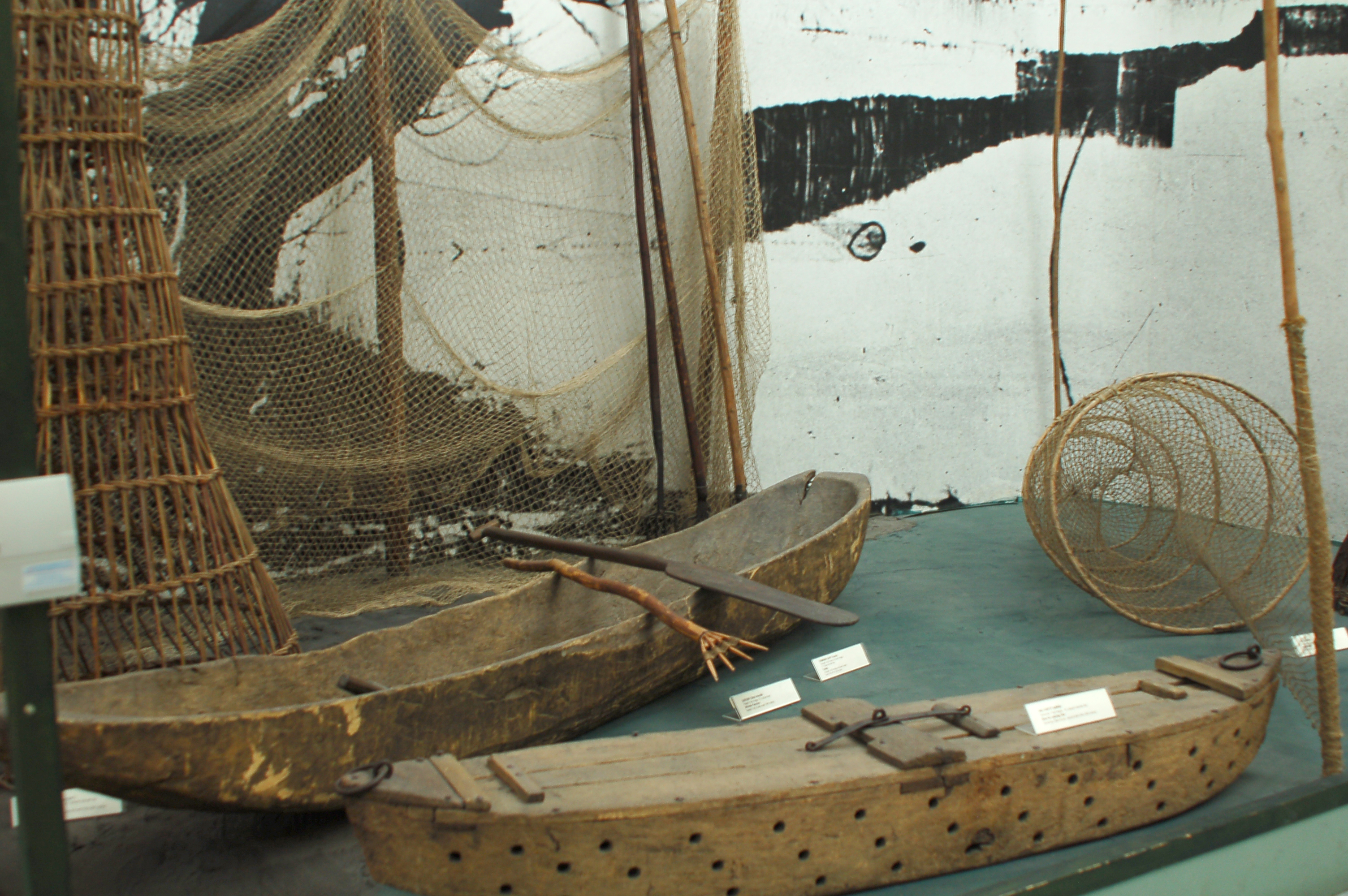 Outils et barques de pêche traditionnelle hongroise, musée ethnographique de budapest.