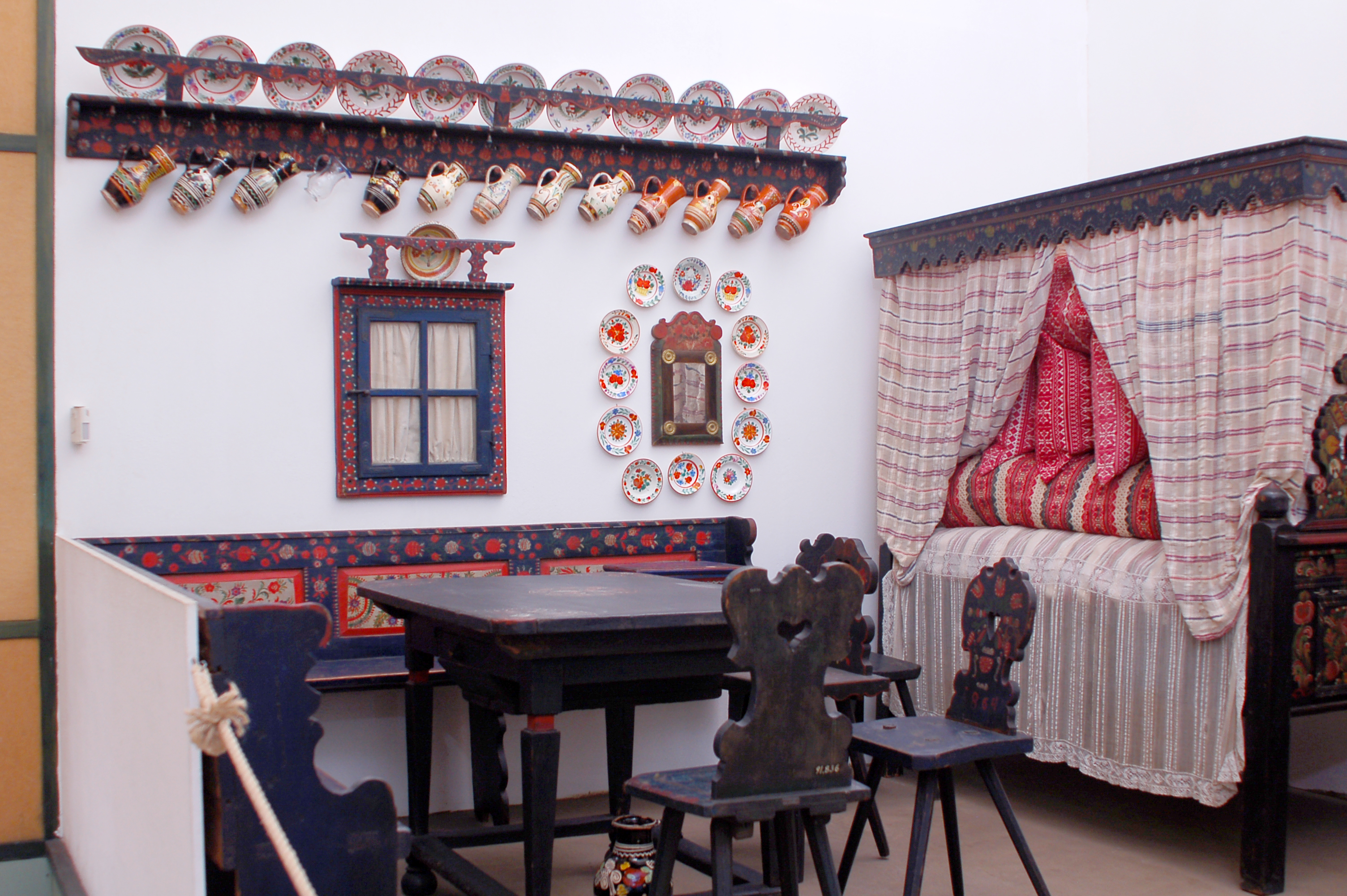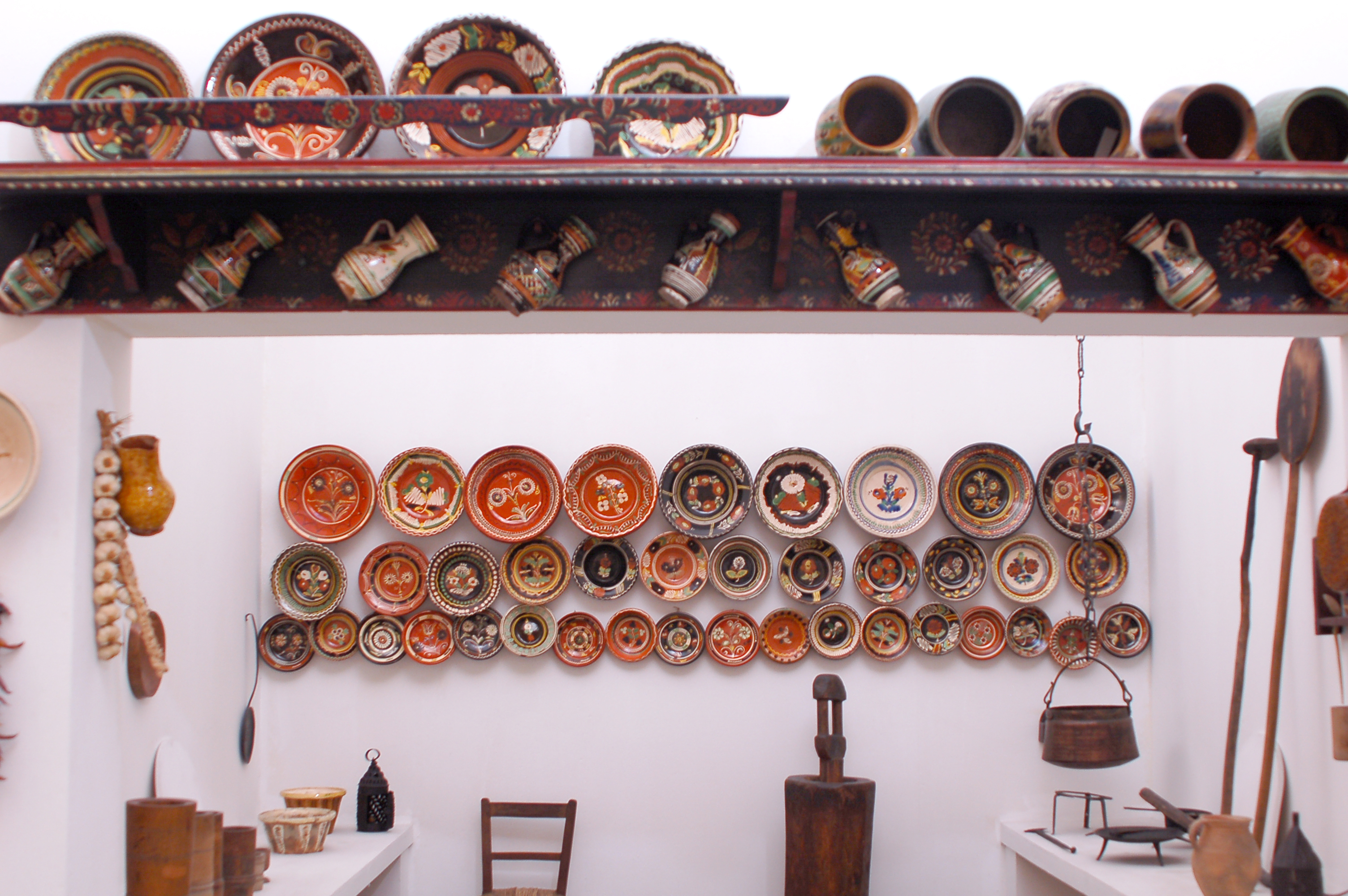 Décorations et objets quotidiens de maison traditionnelle hongroise, musée ethnographique de budapest.