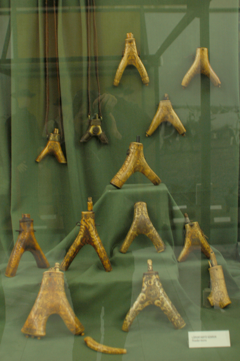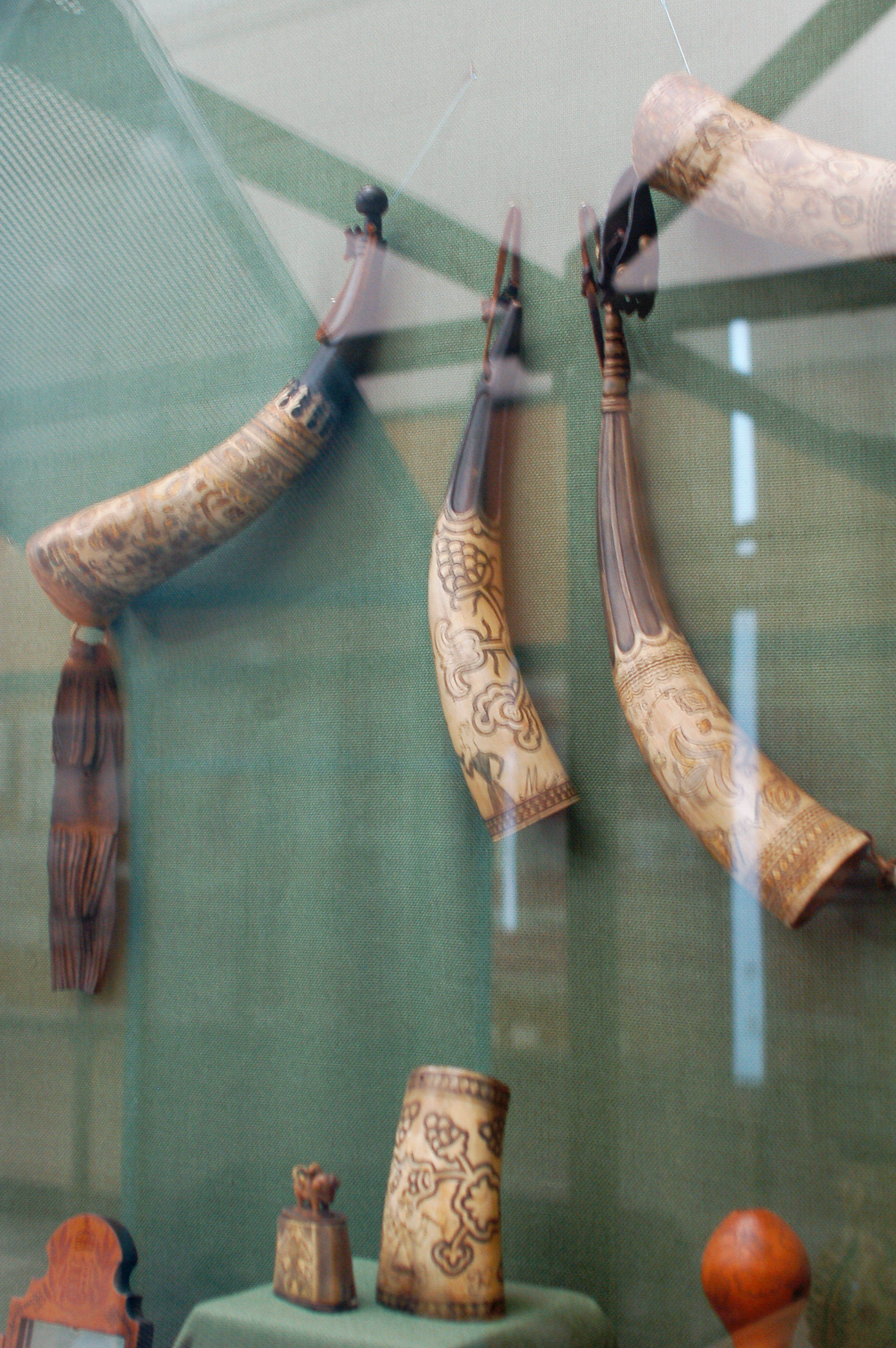 Cornes à poudre (arme à feu) sculptées et décorées, musée ethnographique de budapest.