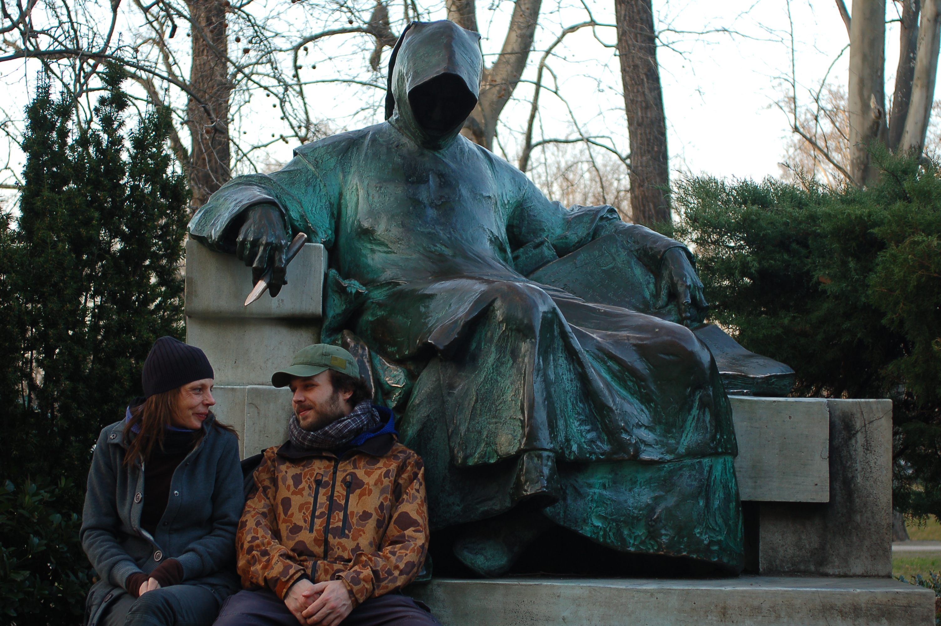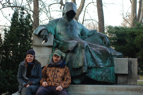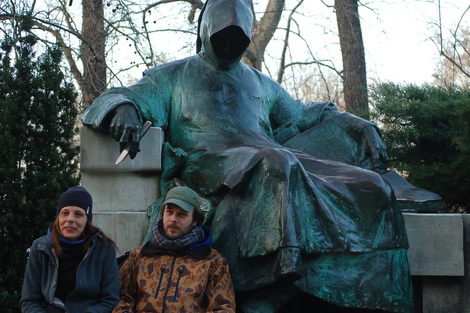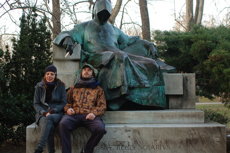 Szonya & Jànos (demi soeur de Jànos) devant la statue de « Gallus Anonymous ».