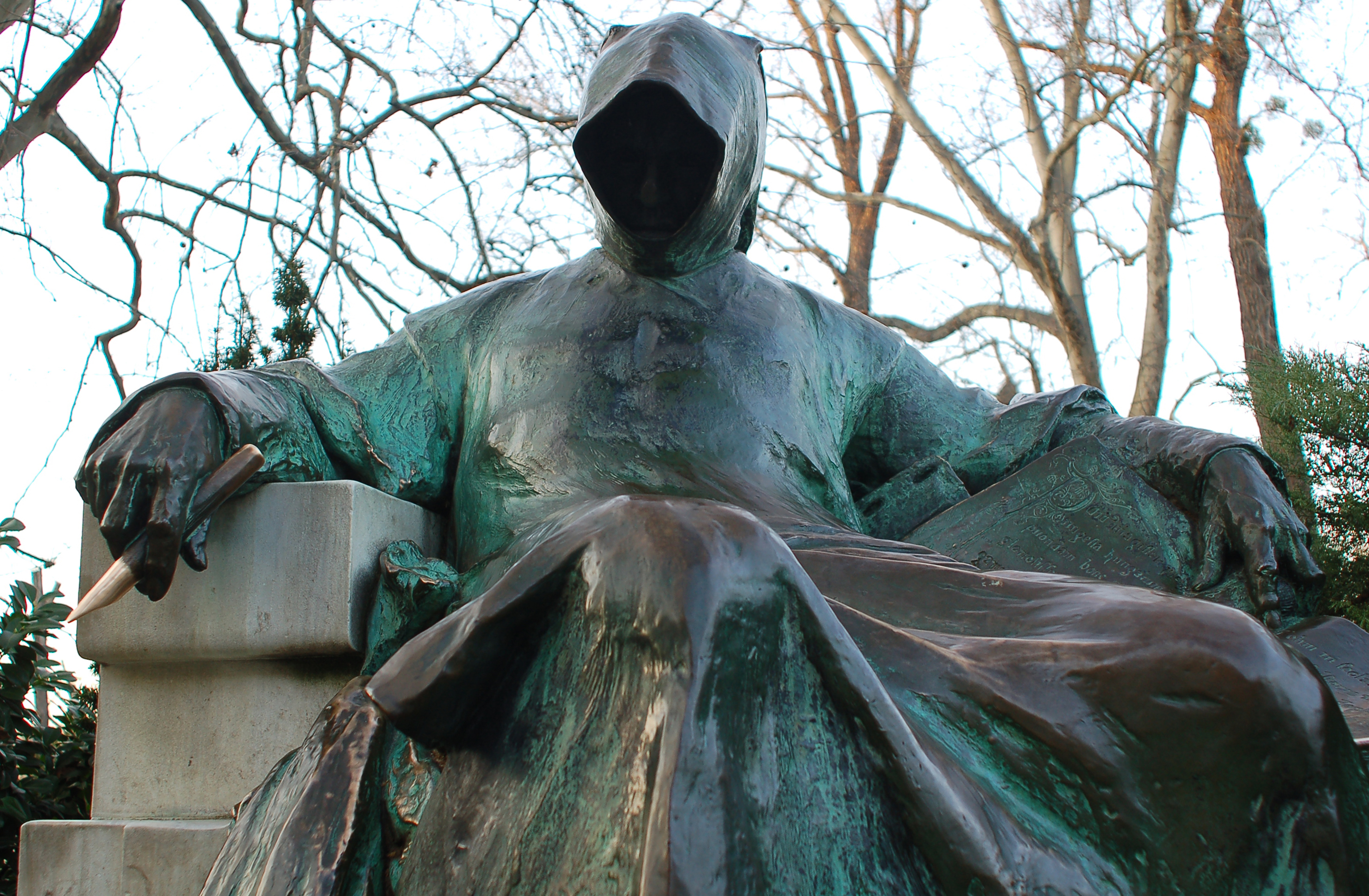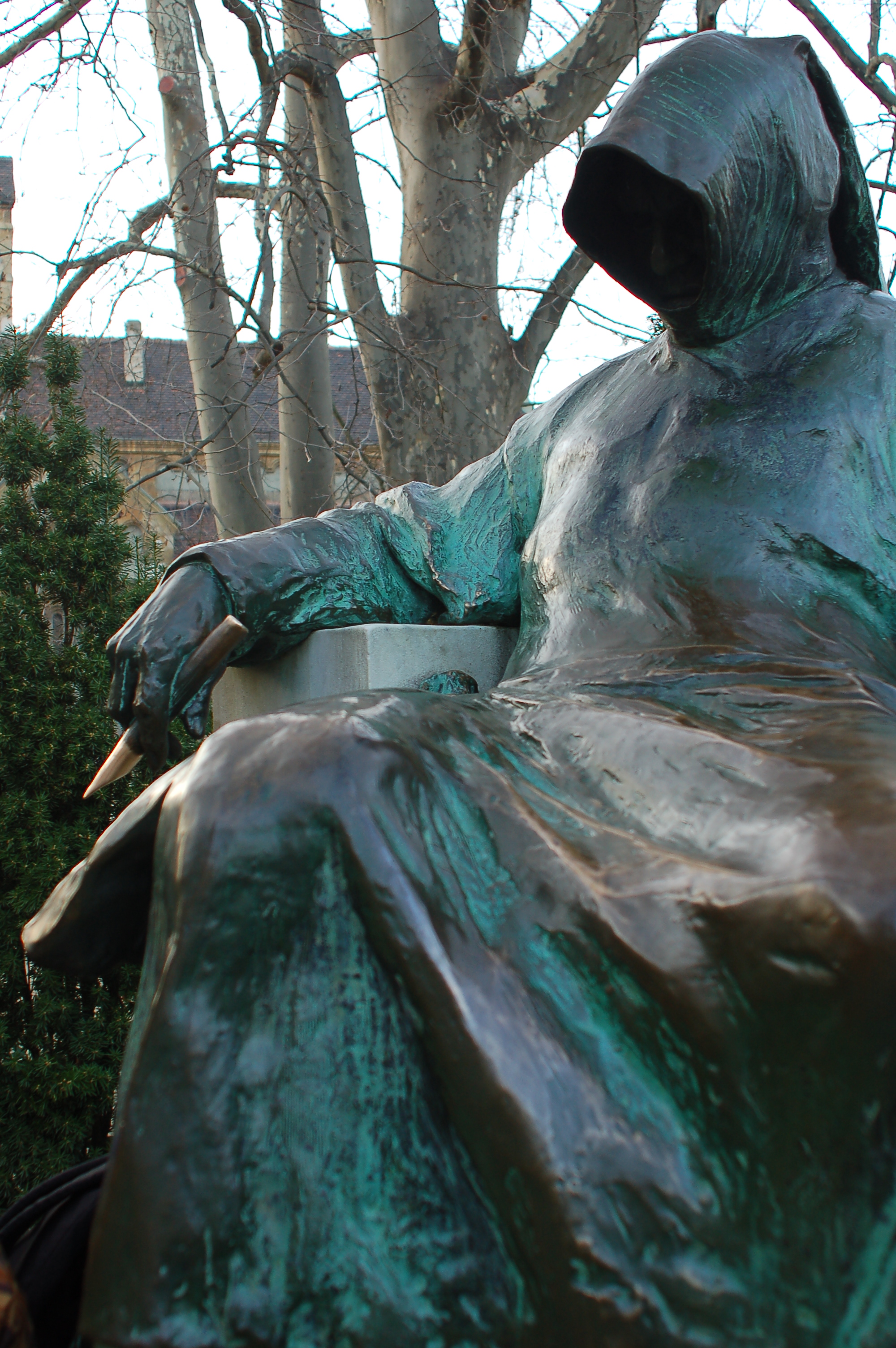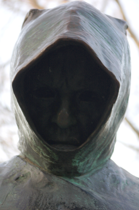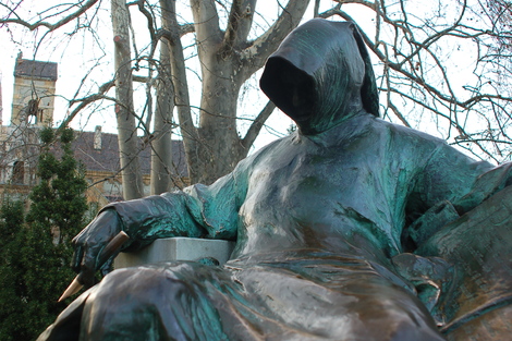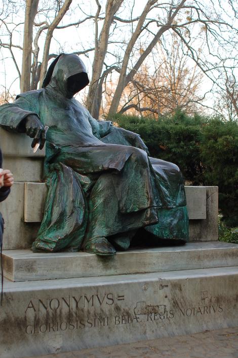 Le visage caché de « Gallus Anonymous », notaire et chroniqueur, auteur de « Deeds of the Hungarians » et peut-être (car son identité à fait l’objet de plusieurs théories) Gesta principum Polonorum. Sculpteur: Miklós Ligeti.