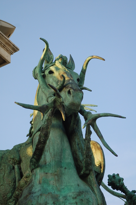 Scultpure haut de l'arche de droite, place des Héros.