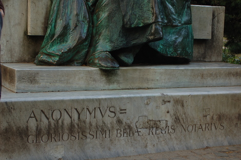 Gravure sous la statue de « Gallus Anonymous », « gloriosissimi belae regis notarus » (= notaire anonyme du roi Béla).